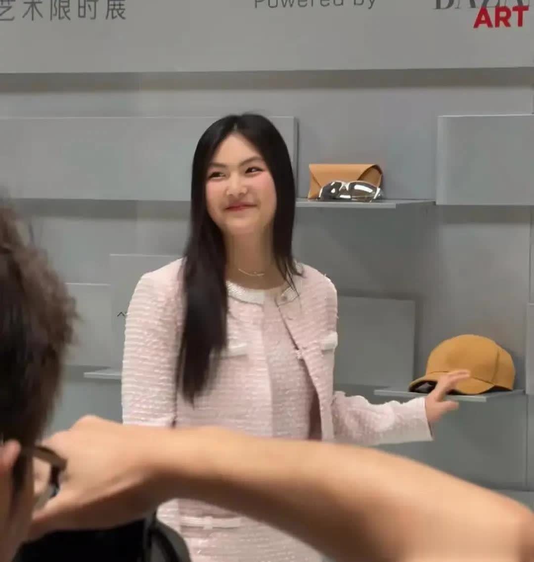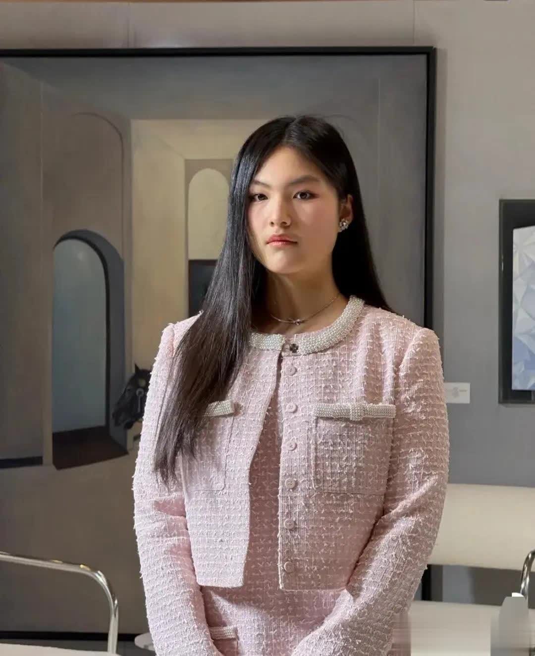 王诗龄身穿粉色小香风套装,脚踩玫红色高跟鞋,手拿名牌包包,整体造型展现出名媛风范。